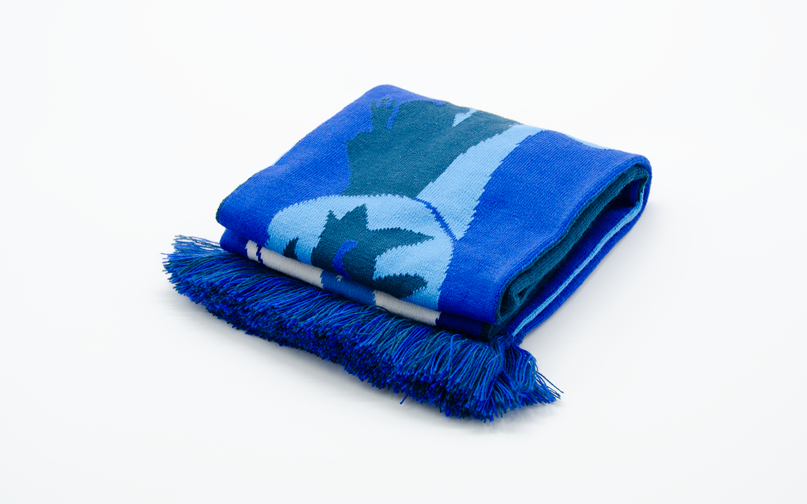 Dans Amours Fantômes, Mathilde Domecq met en lumière l'amour qu'on porte à celleux qui ne sont plus là. Que ce soit un·e conjoint·e, un parent, un animal de compagnie… sur cette écharpe, l'artiste représente cette affection inébranlable qui reste un sentiment positif. Dans des tons de bleu, un peu comme la lumière qui révèle les fantômes dans le livre, on retrouve le trait touchant de l'artiste. Une écharpe toute douce, au sens propre comme au figuré !