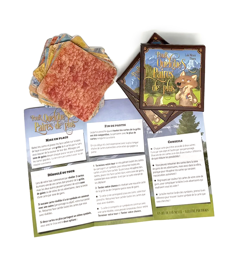Découvrez le mémory compétitif basé sur l'univers de Pour quelques moutons de plus ! Creusez votre mémoire et retrouvez les cartes qui vont ensemble : La sorcière au livre peut aller avec La sorcière à la fleur, ou Elinor au livre… poussez votre chance et allongez la chaîne de cartes connectées par un personnage ou un objet ! Volez les cartes de vos adversaires et sachez vous arrêter avant de vous tromper pour gagner le plus de cartes et remporter la victoire !