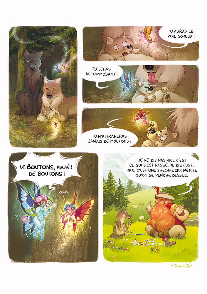 Là haut, sur la montagne, rien n’a vraiment changé depuis le tome 1. Les moutons baguenaudent toujours autant dans les verts pâturages, et le loup n’en a pas encore attrapé un seul. Heureusement, il peut compter sur le soutien de l’ogre, plus ludophile que jamais, et de la marmotte, discrète mais fidèle au poste.