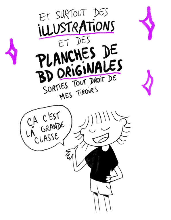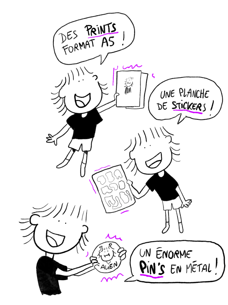 Afin de vous témoigner mon infinie reconnaissance pour le soutien que vous m'apporterez, vous serez dûment RALASS de MOULT CONTREPARTIES super chouettes ! Prints, affiches A3, dessins originaux, pin's, casquettes… Autant de goodies parfaitement appropriés pour décorer les murs de votre chambre ou vous assurer un style vestimentaire imparable.