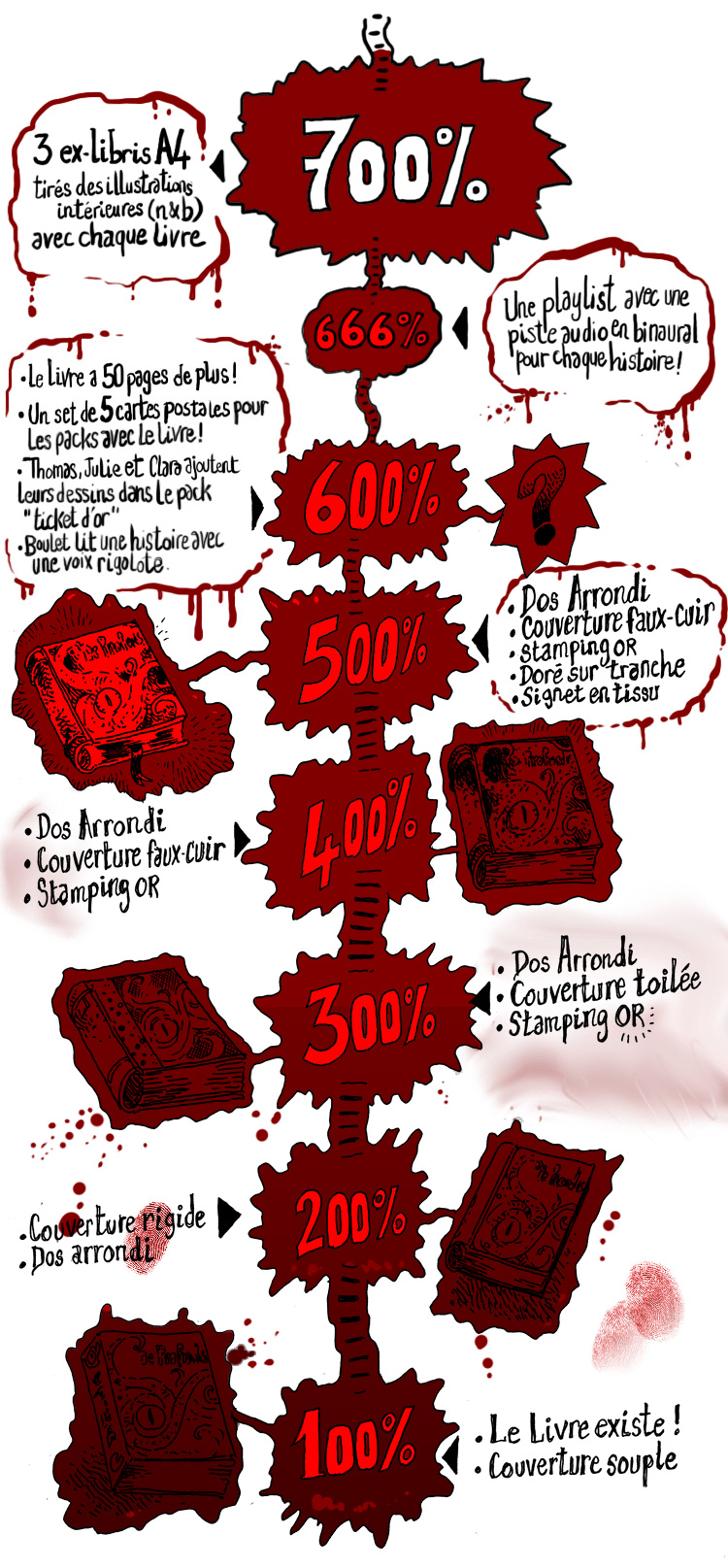 Plus on gagnera de sous, plus on mettra de sous dans le livre. On commencera avec un livre simple, couverture souple illustrée et basta. Et si on arrive tout en haut de l’échelle, il y aura une belle couve en (faux) cuir, dorée et embossée, avec un petit ruban pour marquer sa page, du doré sur tranche et un joli dos cousu. Ce sera un grimoire de ses Grands Morts de presque 500 grammes qui sera le joyau de votre bibliothèque.