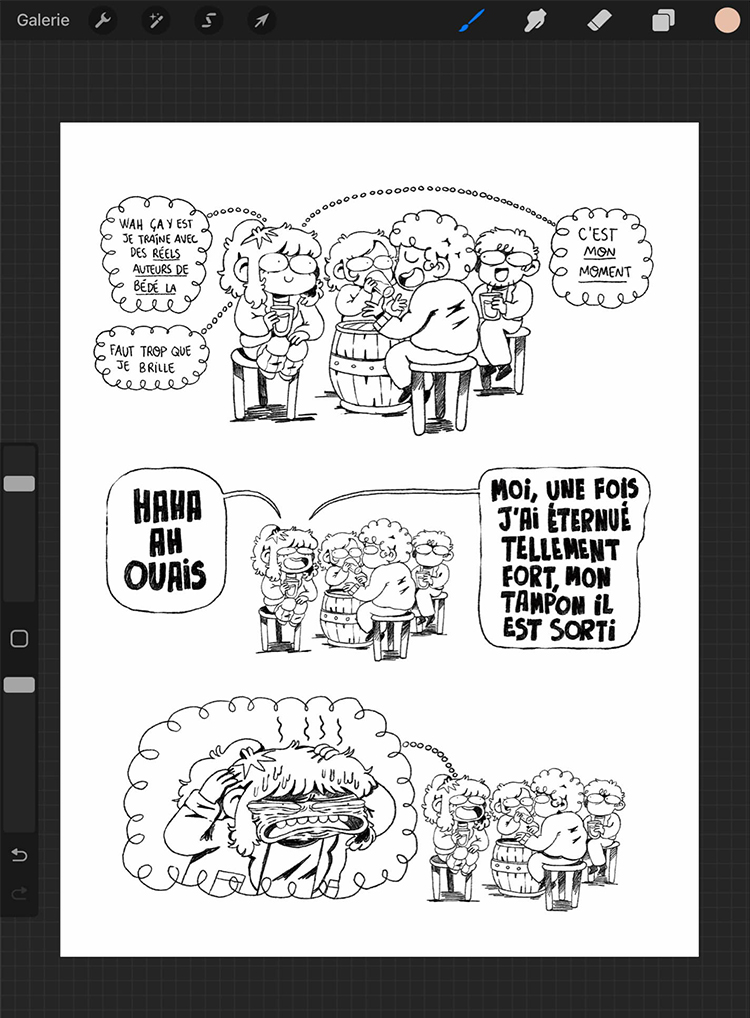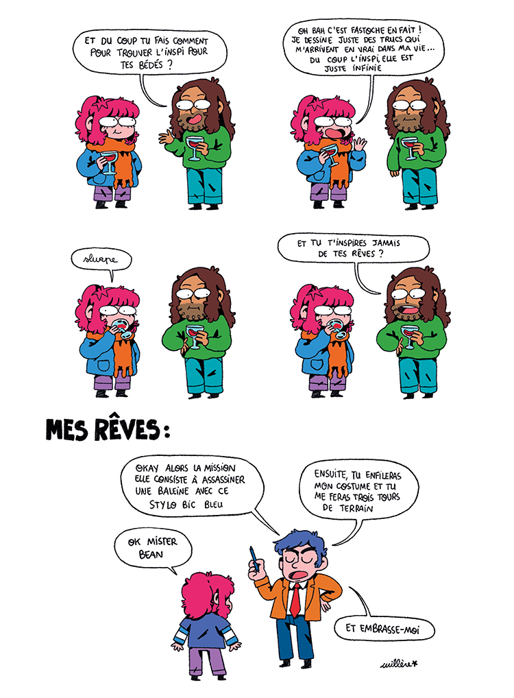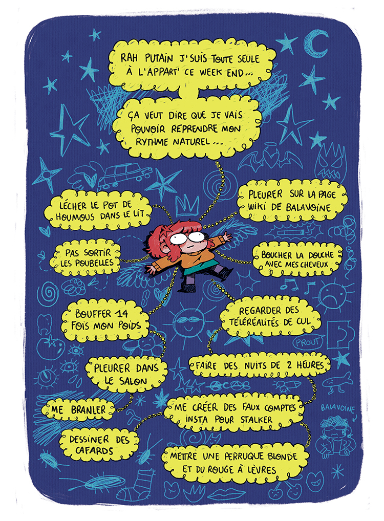 Comme j'ai passé le cap du premier bouquin, je me sens encore moins guindée de partager mes propres potins sans aucun tabou. Déso mamy, déso papy, je vais encore confesser mes pires épisodes pipi caca prout dans un livre, et tous les “Roooh mais tu vas pas raconter ça quand même” du monde n'y feront rien. (Des fois je fais aussi des planches intelligentes je vous rassure, les plus grands de ce monde disent que j'ai beaucoup de subtilité.)